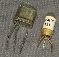 The photograph on the left shows a 'grown-junction' transistor on the left with a (dead) Philco MAT121 on the right. I remember buying packs of unmarked transistors in the early 1970s, many of which were likely Philco rejects. It is a known fact that Sinclair bought sack-loads of rejected transistors from Plessey and Texas which were then painstakingly tested and earmarked for future use. Given that the transistor in the photograph is clearly marked MAT121, I suspect this may not have been a reject.