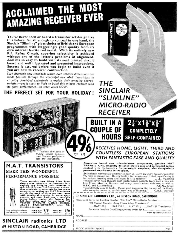 Way back in 1963, when I was 5 years old, a guy by the name of Clive Sinclair marketed his first transistor radio. It was only available in kit-form and cost two pounds, nine shillings and sixpence. The most astounding thing about this little radio was not its performance, but the marketing 'spiel' that brought it to the attention of those who read the various electronics constructor magazines of the day. See the advert below ...