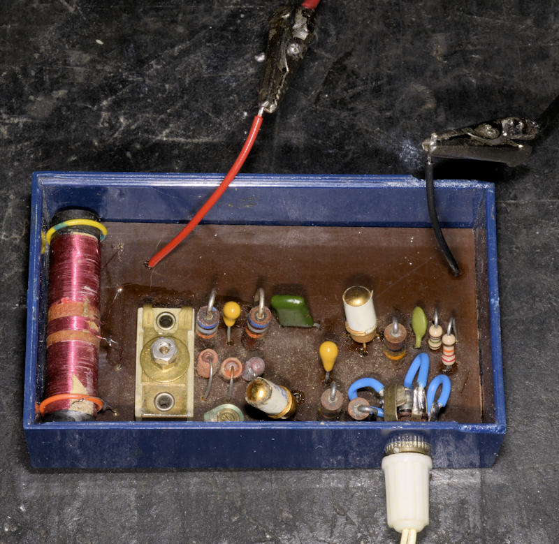 Having replaced all the faulty or broken parts, I still needed to find a suitable PNP transistor to replace the MAT121. The quest for this was somewhat marred by two things. Firstly, there is precious little to pick up on Medium Wave these days, and secondly, what I did hear via the earpiece was woefully quiet. And when I connected it up to a large outside aerial, the set operated like a crystal set! Looking at the schematic that I had downloaded, I concluded that the earpiece was required to be high impedance ... a crystal earpiece. I measured it ... five thousand ohms ... that explained the low audio. In hind-sight, I now think this earpiece may have been the one that came with the Regency TR-1.