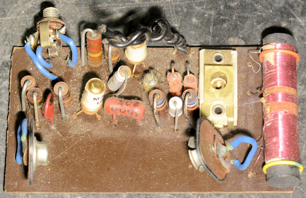 As can bee seen from the above photograph, the OC45 needs to be bent over in order to fit in the 'elegantly styled' pill box. You can also see where the broken aerial windings were repaired. At the moment I'm leaving the modern trimmer in place of the 'gimmick' However a New Old Stock Philco MAT121 is on its way and I'm sure the owner will prefer that I 'revert to the original'.
