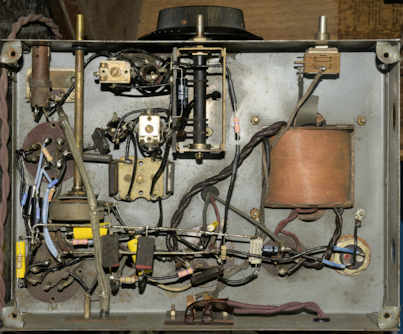 Left: The inside of the Magnum 3AS0523. The fibre rear cover was missing. Note the three wires going from the chassis to the transformer mounted on the loudspeaker. With reference to the schematic diagram, smoothing choke L6 is formed from a section of the primary winding of the audio output transformer.