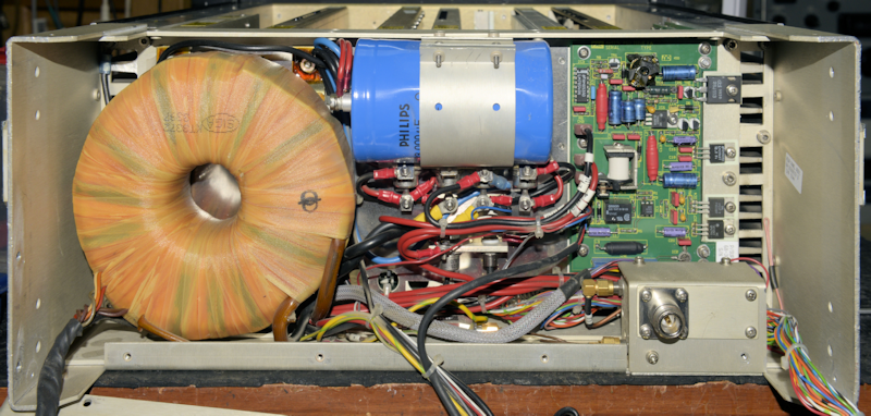 I checked the mains fuse on the 'battered' one and found it to be vaporised. The inside of the glass looked like it was coated in thermionic valve gettering. such was the damage to the rear of this transceiver, that I had to spend time straightening out the side panels before I could get a look inside the PSU compartment. Once inside, I noticed that several Earth wires had been deliberately disconnected. Clearly someone had been chasing a fault ... no doubt related to whatever had turned the fuse wire to plasma! I put this transceiver aside and turned my attention to the other one ... the one in the photograph at the top of this page.