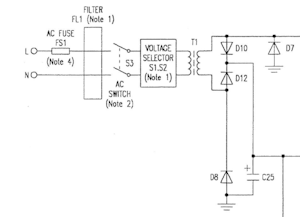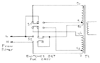 It goes without saying that I was NOT impressed with Park Air's over-simplification of the mains wiring in the PSU (pictured on the left). Switches S1 and S2 provide for four mains voltages between 110V and 240V, yet the transformer is depicted as having a single primary winding.