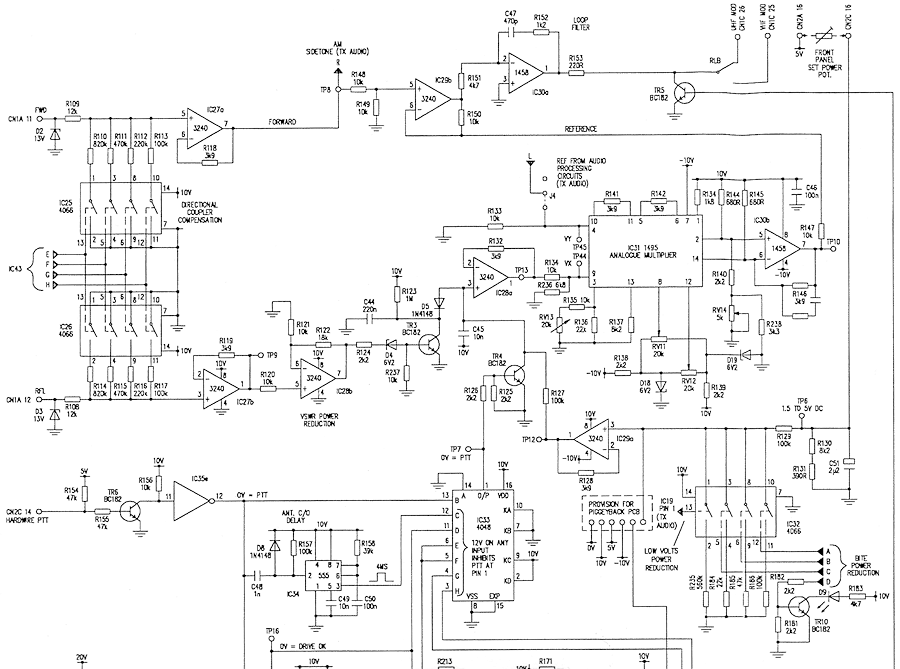 Having repaired several faults in this particular PAE 3030, I was not happy with the disparity between what my Bird Power Meter was displaying and that which was displayed numerically in the Monitor Display. I figured that such a thing would be covered in the manual, in the chapter describing the Transmitter Controller, or in the Alignment Chapter further on in the manual. Not so, or at least it isn't obvious, if it is. The manual does describe a loop whereby the level of output from the RF Power Amplifier is maintained/controlled. This involves the VSWR bridge and elements of the Transmitter Controller module. However, the manual stops short of specifically describing how the key elements in the loop interact. What is obvious is that IC31 has something to do with it all ... and that's where the manual falls over.