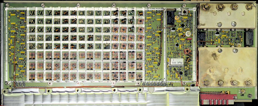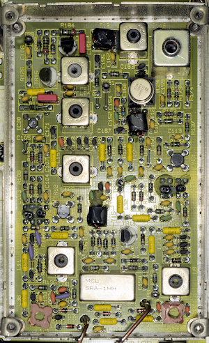 In the photograph above, the eight selectable preselector filters are on the left, sandwiched between PIN diode switches. Further to the right is the broadband RF amplifier, 1st Mixer and 1st IF amplifier stage. The two helical filters are on the far right. The 250.7MHz filter at the top with the larger 70.7MHz filter at the bottom with the selector circuitry in between. Admittedly this is a simplified description.