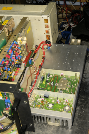 At this point, it was looking as if the transceiver was working ... but then it threw up a BITE error code of 5-4 in the Monitor Display. With BITE error codes, the first number is the Module number and the second number refers to the test that has failed. Module 5 is the Remote Control Decoder Module. However there is no mention of Module-5 error codes in the manual. Interestingly, waiting about 30 seconds after switching on, then running Interruptive BITE appeared to clear the fault. This sounded rather familiar … like the -10V line taking time to 'wind itself up' on a previous 3030. So, I decided to take the PSU board out and investigate things further. Getting the PSU board out is a tedious albeit not difficult job. See the three photographs below.