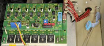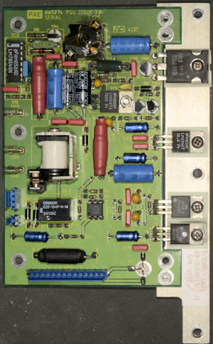 The photograph on the right shows the repaired PSU board. R6 was replaced with a 1.5W version. D11 was replaced with a new 1.3W 6.2V Zener and C7 and C9 were replaced. The board was re-tested on the bench and all supplies were verified as in-spec.