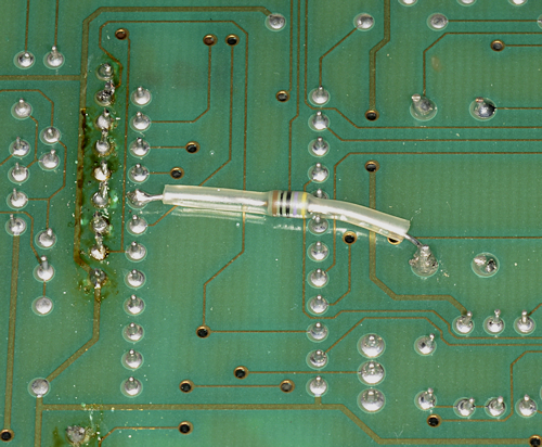 When you think about it, it is very obvious what has happened here. Whoever implemented this 'seemingly undocumented' modification, has counted along the pins of IC28, but on the wrong side. Thus Port-2 Bit-0 input (IC28 pin-8) has been taken to 0V via 47-ohms rather than the corresponding output of Port-6 (IC28 pin-16). Its an easy mistake to make, but how did it get past inspection? Was it EVER tested? I felt sure that this was the cause of the Guard Receiver button and LEDs being functional. I decided that since I was going to replace the 10K network resistors with the correct 100K type, it couldn't 'hurt' to temporarily fit discrete 100K resistors ... hence the evidence of rework and flux in the photograph. I moved the resistor from pin-8 over to pin-16 and was rewarded with a correctly functioning Front Panel where the Guard Receiver Button was now inoperative and the two LEDs remained OFF. The replacement 100K network resistors arrived a few days later, were subsequently fitted and the flux was duly cleared from the board.