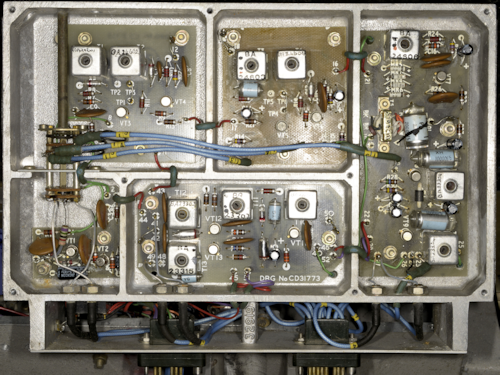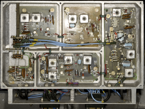 Above: Clock-wise from bottom-left: 200KHz Multiplier (CRX5), Interpolation Oscillator (CRX12), 300KHz Multiplier (CRX10), Hunt Generator (CRX11), Relay A.