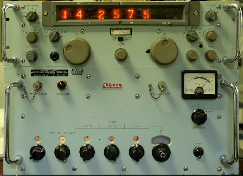Above: Just for fun, I connected the MA350B up to an RA1218. Here, the MA350B is supplying three inputs ... the 2nd VFO, the 3rd VFO (1.7MHz) and the 1MHz signal. It was very reassuring to see that the Nixie display mirrored the MA350B settings.