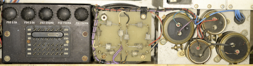 Note that the four Decade switch shafts have universal joints at either end. This is not just so any misalignment from front to back can be catered for. Once all six Allen screws supporting the casting that supports the rear switches are removed, it is possible, with care, to ease the bank of switches up and out in order to access wiring. That's the theory. It isn't quite that simple as there is a distinct lack of service loops, which will be explained in due course.