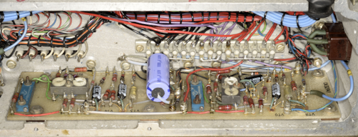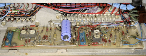 The Power supply in the MA350 is simplicity itself, comprising two somewhat similar regulator circuits ... one delivering +12V and the other -6V. The 12V supply is the more critical of the two since the switched resistor networks for the VCO circuits are connected across it. The -6V line is not so critical, but both supplies can be set precisely by way of multi-turn potentiometers. All four of the radial smoothing capacitors carried markings which suggested that they were checked or re-formed in 1972. That was 53 years ago, so I decided to re-stuff them rather than simply apply 240V mains and hope that they didn't go bang. A good decision, as the next photographs will suggest.