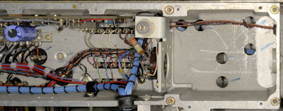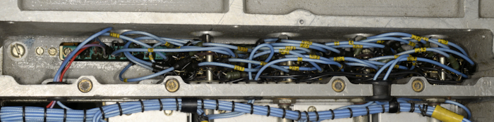 However it wasn't that easy. Yes, the six Allen screws were easy enough to remove, but getting the assembly to move was another story. When I finally managed to tilt it, it was only by a few degrees. The problem was two-fold. First, there is a hole through which three wires head off to the PSU and a single coax disappears into a tight bundle of similar blue coax. It was necessary to break into the wire harness in the PSU to get some more movement. That worked. However the second issue was a total lack of service loops between the edge connector and the switch wafers. I have no idea how this was assembled!