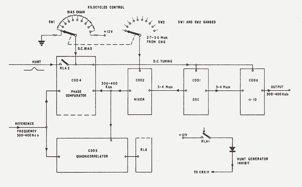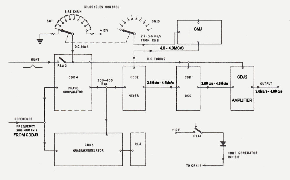 The idents, CDD1 thru' CDD6 identify the individual boards that make up the CDDJ unit. For some reason these idents differ from those on the actual schematic, but I will refer to those in the simplified diagram for the purpose of explaining how it works. Oscillator CDD1 is a VCO which is initially pre-tuned using a voltage derived from the bias chain selected by SW1. The selected voltage/bias is such that the oscillator is roughly set to a frequency 300KHz higher than that selected by SW2, which is applied to Mixer CDD2. Thus, the output of Mixer CDD2 is 300KHz. This is fed to both the Phase Comparator CDD4 and the Quadricorrelator CDD5. A triangle-wave Hunt signal from the CRXJ Reference Module is applied via RLA and 'takes control' of the VCO. For CDDJ1, the Reference Frequency is the 300KHz generated in the CRXJ Reference Module, and is applied to both the Phase Comparator and the Quadricorrelator. The latter is really just a phase-controlled switch which removes the Hunt signal when both inputs are in-phase. When this happens, VCO CDD1 is then under the control of the error signal from the Phase Comparator CDD4. The output of the VCO is also fed to Divider CDD6 which provides the Reference signal for CDDJ2. Consequently, CDDJ2 provides the Reference for CDDJ3, which ultimately provides the the Reference for CDJ.