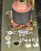 As an aside: Something worth noting here is that the driver stage (actually the harmonic generator itself) employs a Tunnel Diode ... a Philco 1N3562. This is the small gold TO-18 device in the two photographs above. There are five more of these devices in the MA350 ... one in each of the CDDJ modules, and two in the CMJ module. Tunnel Diodes tend to be used in circuits where very fast rise (and or) fall times are required. As such they are ideal for generating harmonics, since mathematically speaking, these incredibly fast edges are rich in harmonics. Where Tunnel Diodes tend to be used at relatively low frequencies, Step-Recovery-Diodes or SRDs were often used to generate harmonics up to several GHz. Tunnel Diodes have been in production since the early 1960s, and although modern technology has seen them superseded, they are still manufactured in small numbers today, and generally NOT in TO-18 format. Expect to pay upwards of £10 for one today.