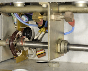 Getting the wiring harness out is easier said than done. Assuming you have a complete unit, the alignment plate at the rear needs to be removed first. This is the plate which ensures that the inner rack correctly aligns with the outer rack. With that plate off, we now have to remove the rear frame which fits between the two side panels. Only now can we access the wiring harness, which itself is mounted on two guide plates. Two 2BA screws hold the two 'halves' together and a further four 2BA screws secure the two plates to the side panels.
