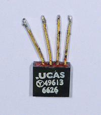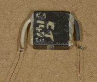 Ask anyone with experience repairing SMPSs and they will more often than not tell you to check the capacitors ... which I did, and they all checked out very healthy. I then isolated every transistor and diode ... and they all checked out OK. Then I realised that I hadn't checked out the bridge rectifier. That was because, unlike everything else, it was hidden. I found it loosely clamped to the side of T1, under the chopper board. It was quite a small device (see right), being only about 1cm square. When I examined the wiring to it, I found that the rubber insulation was brick hard. Over-heating maybe? Slightly worrying, there was evidence that some solder had run down one of the legs, inside the rubber insulation, towards the body of the rectifier. The date code on it was for week 26 of 1966. I figured it might be Germanium and not as robust as Silicon but it turns out it is Silicon. Maybe it was time to replace it? After removing the rubber insulation and de-soldering the wires, I checked it and found that one of the four diodes was showing as a low value resistor.