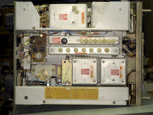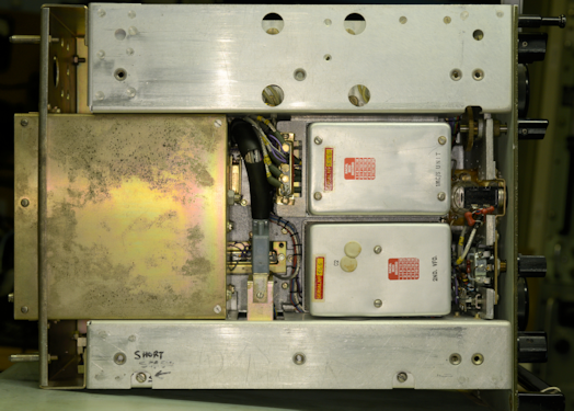 Coincidentally, ignoring the faulty power supply, the fault on the other (earlier) RA217D turned out to be very similar. Having already ascertained that the 2nd VFO was not an issue. And since there was distinctive 'chuffing' audible when the MHz control was turned, the 1st VFO and 2nd Mixer were thus ruled out as being at fault. Chasing a signal through the RF unit quickly identified the location of the fault. The Preselector was functioning, but there was very little signal present at PL1, the output of the RF Unit. Unlike in the RA1217 where everything is instantly accessible, the RF amplifier and Preselector in the RA217 is effectively folded up to fit inside a cuboid enclosure.