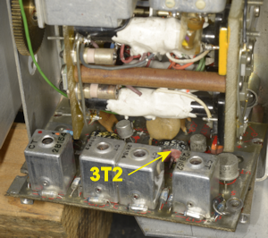 It was whilst peering into the gap between the PC board and the Preselector that I noticed that one of the ferrite components appeared out of place. Further examination revealed that this was 3T2, in the Collector circuit of 3VT3, the second RF amplifier, and one end of it had become detached from the PCB. As with the inductor on the Detector board, this was formed from 40 s.w.g. wire on a small binocular ferrite. As with the Detector board, this ferrite had originally been glued to the board but was now hanging free, secured by two of its three wires.