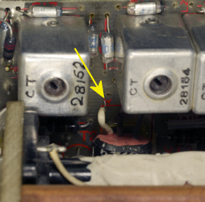 The photograph on the left shows just how awkward it is to gain access to the components on the RF Amplifier board. The board is mounted on its side and secured to two pillars with four 6BA screws. Two of these are relatively easy to remove, but the other two, closest to the chassis are incredibly difficult to access. I eventually managed to take all four screws out, and although the attached wiring severely restricts the movement of the board, I was able to get just enough movement to enable me to clear the hole left by the broken wire. Once that was done, I attached a length of 40 s.w.g. wire to the end of 3T2 and after much frustration and 'blue air', I finally coaxed the end through the hole and soldered it in place. A dab of Superglue then secured the transformer to the board and the latter was then re-attached to the pillars.