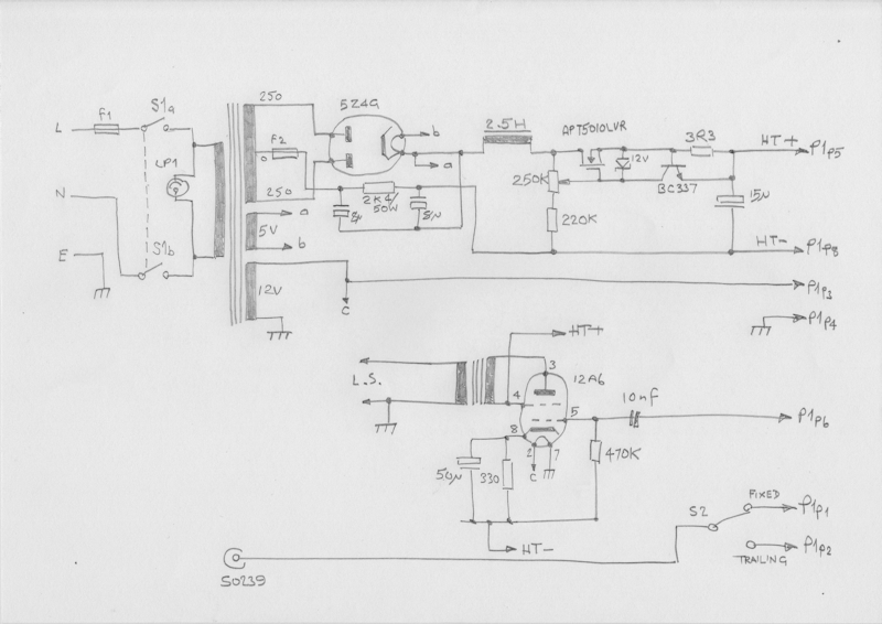 The audio amplifier is based on everybody's favourite 6V6 circuit. Note that while the output is with respect to chassis, the cathode and grid circuits are connected to HT-. This is necessary since if the latter were connected to chassis, the current drawn by the 12A6 would have an adverse influence on the HT- line and thus impair the AVC performance, amongst other things.