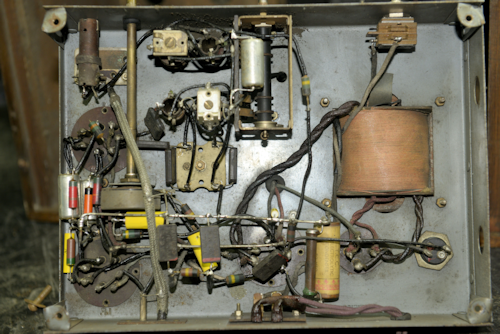 As soon as the chassis was mounted back in the wooden case it stopped working. On taking the chassis out of the box, it burst into life again. This turned out to be an electrical failure caused by a mechanical failure. I found that the extension to one end or R12, which delivers the AGC voltage to V1 via L3 and L2, was intermittent. The original joint was hidden within the long length of woven insulation. If you look at the two under-chassis photographs above, you will notice that the four corner brackets for the four mounting screws are NOT level or parallel to the top of the chassis. Thus when the screws were tightened, they distorted the chassis just enough to pull the connection inside the sleeving apart. Once this joint was re-soldered, the receiver worked when the chassis was attached to the case.