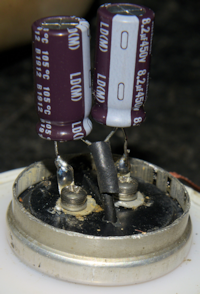 Right: The smoothing pack was re-stuffed with a pair of modern radial 8μ2/450V aluminium types. I was able to cut the can open in such a way that the top section slipped firmly over the narrow section without any requirement to glue it together.