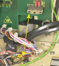 Left: Just on the off-chance that something was amiss behind the front panel, I removed the eight screws and folded it down. The wiring immediately behind the front panel is a tad cramped. I noticed that the 'fin' on the audio amplifier (IC36) exhibited signs of possible arching and that contact had been made with the DC Supply LED. However, in this case, since the fin is totally isolated, it is unlikely that arching was the cause. Checking the yellow wire to the DC supply LED: According to the circuit diagram for the main PSU, that particular wire should be violet. When it leaves the PSU board, it is violet … so why is it Yellow? Answer: It goes through two connectors on the BITE Assy. board before arriving at the LED ... Violet wire onto the BITE board … yellow wire on leaving the board. Why on earth change the colour of the wire?!! At least with the RA17 etc. you know where you are with wires … blue is the anode circuit, orange is the screen-grid and yellow is grid-1. In the end I concluded that the marks on the fin were simply corrosion. Then one of the pins on the LED broke off. Fortunately I had a spare in stock. I noticed that Links LK2 and LK3 were not fitted. These appear to set the Side Tone for 3030 or 1207 operation. I have no idea what a 1207 is. I fitted the two links in the 3030 position.