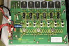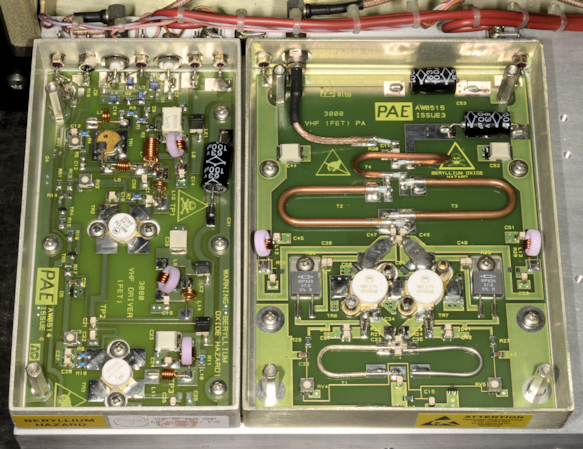 The Output stage employs a pair of MRF174s in parallel. With each device rated at 125W output, this stage is capable of safely delivering at least 200W, should it receive enough drive. Since the maximum output power of the PAE 3010 is given as 40W on AM or 60 on FM, none of the RF devices in the RFPA are likely running at more than 25% maximum ratings.