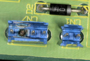 The photograph on the right shows the repaired PSU board. R6 was replaced with a 1.5W version. D11 was replaced with a new 1.3W 6.2V Zener and C7 and C9 were replaced. The board was re-tested on the bench and all supplies were verified as in-spec.