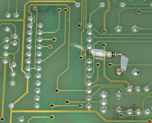When you think about it, it is very obvious what has happened here. Whoever implemented this 'seemingly undocumented' modification, has counted along the pins of IC28, but on the wrong side. Thus Port-2 Bit-0 input (IC28 pin-8) has been taken to 0V via 47-ohms rather than the corresponding output of Port-6 (IC28 pin-16). Its an easy mistake to make, but how did it get past inspection? Was it EVER tested? I felt sure that this was the cause of the Guard Receiver button and LEDs being functional. I decided that since I was going to replace the 10K network resistors with the correct 100K type, it couldn't 'hurt' to temporarily fit discrete 100K resistors ... hence the evidence of rework and flux in the photograph. I moved the resistor from pin-8 over to pin-16 and was rewarded with a correctly functioning Front Panel where the Guard Receiver Button was now inoperative and the two LEDs remained OFF. The replacement 100K network resistors arrived a few days later, were subsequently fitted and the flux was duly cleared from the board.