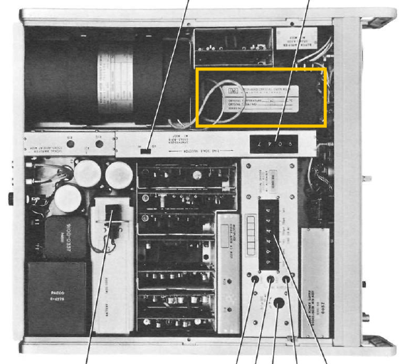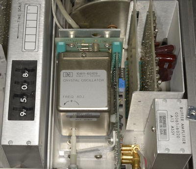 The image above shows the location of the 5MHz OCXO. It also shows it to be a sealed unit, a fact confirmed by figure 8-20 on page 8-53 of the manual which shows that the A10 Oscillator Assembly consists of four interconnected assemblies contained within a double-insulated sealed enclosure and that the oven runs from 115V AC. Nothing like the A10 5MHz OCXO that I was looking at.
