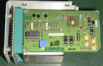 The photograph on the left shows the A10 Oscillator module removed from the chassis. Unfortunately, since the module shown in the manual is a sealed unit, there is no circuit diagram, so I was going to have to 'wing it' here. Powering it up was easy ... +24V, +20V and +15V ... although the 15V line was probably unnecessary. I was relieved to see that the oven and the oscillator were functioning correctly. The signal from the oscillator comes onto the board in the photograph at the top left. the 14-pin DIL chip is some sort of Dual D-Type Flip-Flop and HP's part number translates as type 4345 which I could not find any data on. However I did find an HP manual for another piece of test equipment which mercifully gave me the pin-out. Only one half of this IC is used to 'square off' the incoming signal. The three transistors at the top form some sort of level control ... which I found to be non operational. The fault turned out to be an open-circuit 500R trimmer potentiometer. I didn't have a suitable replacement, but I fitted a 1K trimmer of similar form-factor which did the trick. I was now getting close to 3V p-p at J3 on the module.