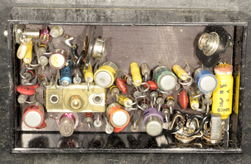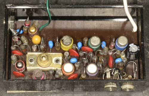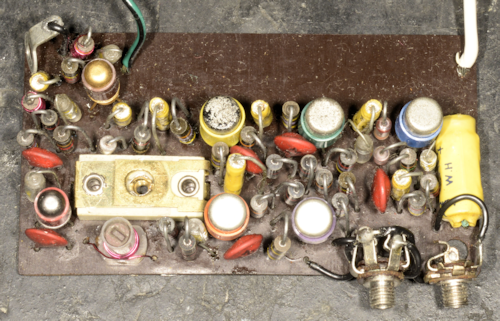 Above: The two Micro-FMs ... very similar but some subtle differences. I believe the one on the left to be slightly older as the two left-most transistors appear to be Philco M.A.T. devices. Also, there is a wire link on the PCB just to the left of the red ceramic disc capacitor just below the transistor with the orange sleeve. This link does not feature on the board on the right, and the location of the tiny polystyrene capacitor (C10) has been moved slightly. The items list shows C4 as 6.4uF. This is the blue miniature electrolytic capacitor in the photograph on the right. C4 on the board on the left was found to be 1uF. This change in value from 1uF to 6.4uF looks like a modification of the AFC time-constant.