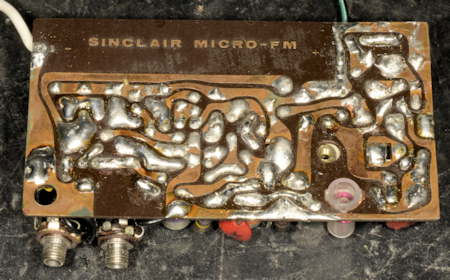 Above: Turning the boards over was very revealing. The Micro-FM was sold as a kit, there being no option to purchase it pre-assembled. It has to be said, that like the Slimline, the quality of the board is poor ... very thin Paxolin. But to be fair, fibre-glass boards were rare in those days. Interestingly, as with the Slimline that I worked on, the leads on the components on both boards had been cut incredibly short, such that the wires barely protruded through the holes. This wasn't a big issue on the board on the left where albeit generous, the quality of the soldering was generally good. The same could not be said for the soldering on the board on the right where the quality of soldering was simply atrocious. In many places the solder was adjacent to the wire. Many of the components were loose as a result. I ended up using solder-wick to remove most of the solder then re-soldering the joints. Afterwards, the board was 'washed' with 'Flux-Off' ... and in doing so, I learned something very interesting. I noticed that the black Micro-FM case looked as if it has been splashed with something. And that 'something' would not wipe off. It turns out that spray from the can of Flux-Off was the culprit, and the solvent that does a brilliant job of removing flux was reacting with the plastic box and literally melting it!! I have been using Flux-Off for may years and never encountered this before. What cheap plastic were Sinclair's boxes made from?