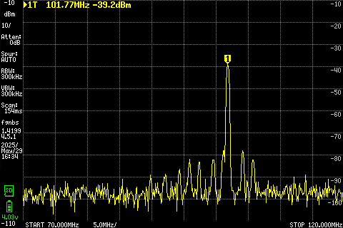 Left: A screen-grab on my TinySA Ultra showing the Local Oscillator of one of the Micro-FMs amidst a cluster of local Band II stations.