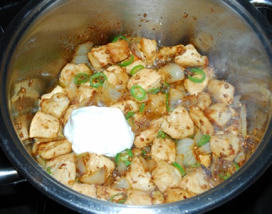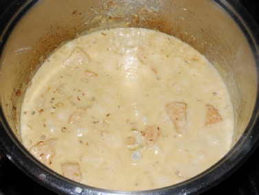 Speaking of which, it is now time to add the yoghurt. Turn the heat down a bit; we don’t want the yoghurt to separate. Add a tablespoon of yogurt and mix it in. Keep stirring until the yoghurt appears to have gone. Allow any water content to boil off too. Add the yoghurt one tablespoon at a time using this method, after which, the chicken should be coated evenly. Place the cinnamon stick in the pan and cover it with the chicken. Stir in the cream and ground almonds. Reduce the heat, put a lid on the pan and simmer for about 20 minutes, stirring occasional so that it does not stick to the bottom.