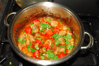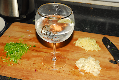 Now return the lamb, with any juices, to the pan. Take the bunch of fresh coriander and finely chop the bottom inch of the stocks and add this with the sliced chillies to the pan. Mix well and cook un-covered for a further 5 minutes. You now have time to pour yourself a glass of gin!