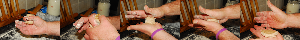 Now comes the fun bit! Take each piece in turn and hold it as in the far left photograph, then squeeze it and turn it so that it is narrow in the centre ... sort of like a waste. Now place it between the palms of your hands and compress it ... twisting your hands in opposite directions until you have a patty as in the photograph on the far right. Dead easy! If you look at it, you should have visible coils of ghee and dough on both sides.
