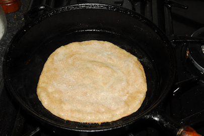 Now take about one dessert-spoon of the oil and ghee mixture and put it in a flat-bottomed frying pan or better still, a skillet. Initially heat it up high then drop it back to a medium heat. As the skillet is heating up, re-dust your working area with flour and roll out your first paratha to about 8 inches (20cm) diameter. Make sure the bottom of the skillet is evenly coated in about 1mm of oil/ghee. Place the paratha in the skillet and press it down all over. I use the back of my hand/fingers for this bit. Your paratha should immediately show signs of puffing up in places. Now go back and roll out the next paratha. When done, flip the paratha in the skillet. It should look like the one below.