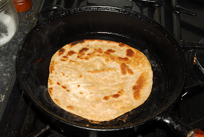 Continue to fry the paratha for a further 30 seconds. Then turn it out onto a plate and keep warm under a tea-towel. Add another dessert-spoonful of oil/ghee to the skillet, make sure the bottom is evenly covered then place your next paratha in the pan. Repeat this procedure for each paratha. You may need to 'purge' the skillet of burnt flour at least once. This is best achieved by scraping it to one side and lifting it out with a fish-slice.