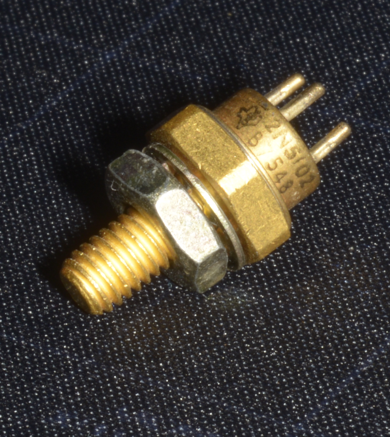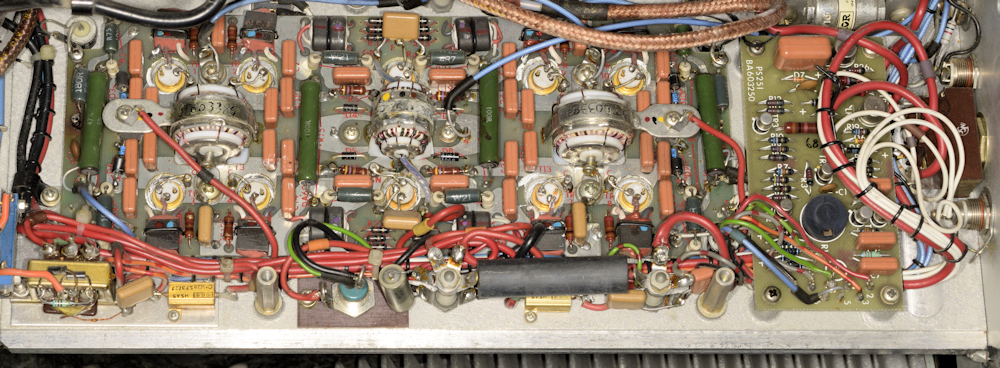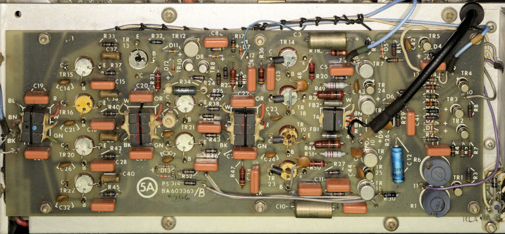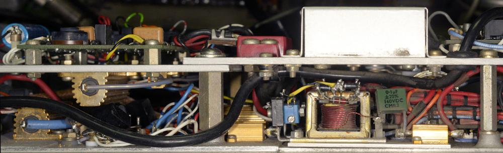 In total, ten R.F. transistors are used to take the nominal 2W drive from the Low-Level board up to 125W. Initially these were type 2N5102, by RCA and maybe later by Texas and/or ASI. Interestingly, the 2N5102 is described as a VHF device, intended for Class-C AM avionic transmitters. It has a specified output of 15W with a maximum dissipation rating of 70W. hFE is given as between 10 and 100. Data on the 587BLY is scant, however it does appear to have been designed for use in military HF transmitters with roughly double the current and power rating of the 2N5102. The 2N5102s by RCA and ASI do not include a protection diode between Collector and Emitter, whereas the Texas-manufactured 2N5102 and Philips 587BLY do.