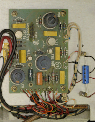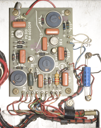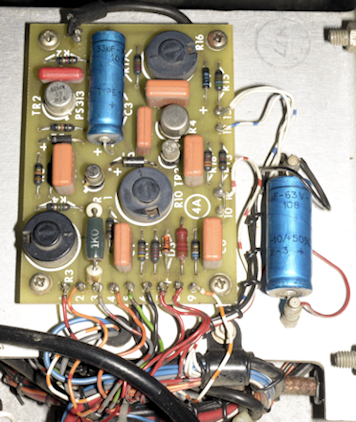 The image on the left shows the implementation of the mod found in seven of the eight MM420s that I have seen that are configured for long time-constant ALC. (The eighth MM420 was an early example that didn't have the mod fitted.) In this configuration the rectified output from the transformer is fed to the base of TR2 on the PS313 board in the Stabiliser Module. The sensitivity of the circuit can be set via the potentiometer. I have no details on how to set this up.