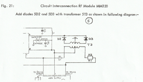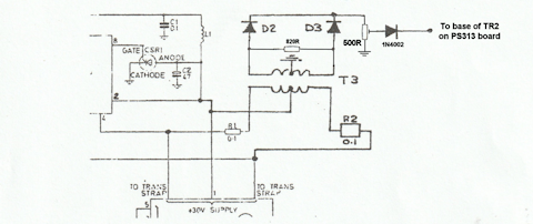The image on the left should be viewed in conjunction with Fig. 21 in the TA.1813 manual, and shows how the transformer T3 integrates with the MM320 wiring. This mod is clearly intended to respond to high transient spikes in Collector Current and fire the thyristor, which would be seen as an over-current event, triggering the crowbar in the Stabiliser Module. What the diagram doesn't show is that in ALL installations of this mod, there is an 820R resistor across the transformer secondary.