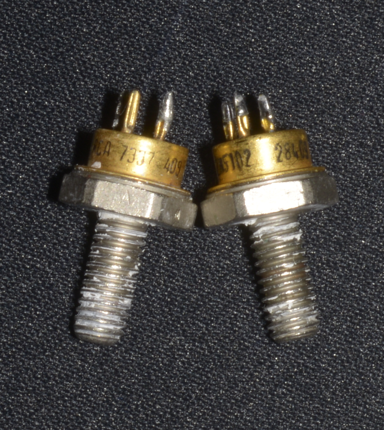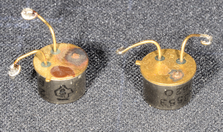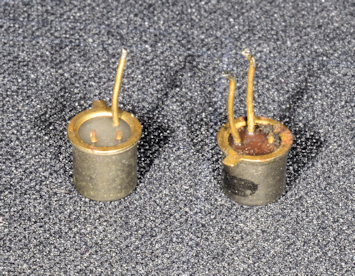 Bottom-Left: These two devices came from an MS440 Stabiliser Unit. During fault diagnosis I had need to lift the legs in order to isolate the devices. Note how the wires snapped some distance away from the hermetic seal.