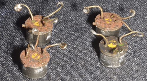 Top-Right: Shows four transistors removed from Low-Level boards. Note the extreme nature of the corrosion. Although this appears to be quite common, it does not necessarily affect every device on the board.